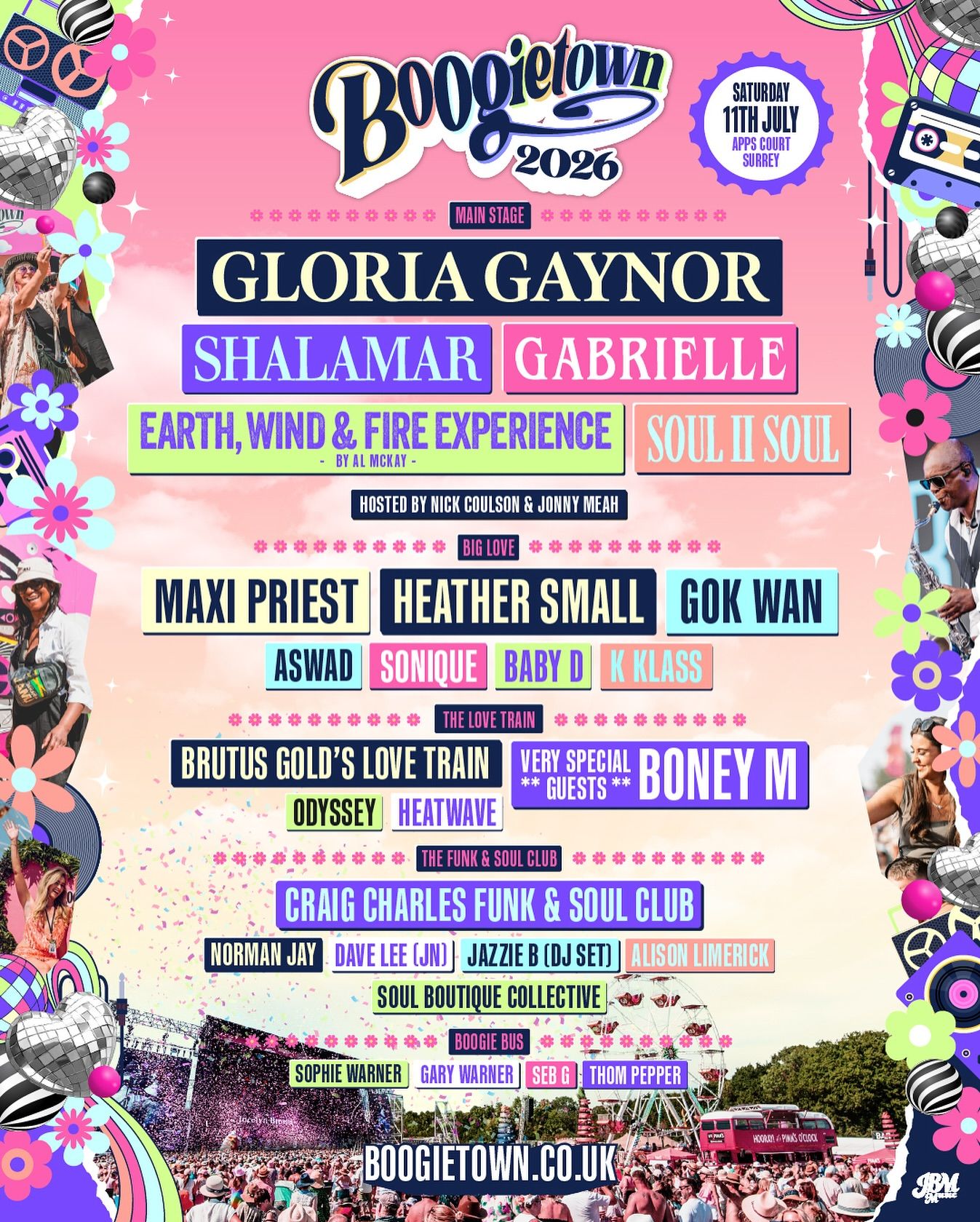 Headlining the Main Stage is disco royalty Gloria Gaynor, making a triumphant return after performing at the very first Boogietown. She is joined by a powerhouse cast including Shalamar, Gabrielle, Earth, Wind & Fire by Al McKay and Soul II Soul, with hosting duties handled by Jonny Meah and Nick Coulson. Together, the bill delivers a masterclass in timeless disco, soul and dancefloor classics.