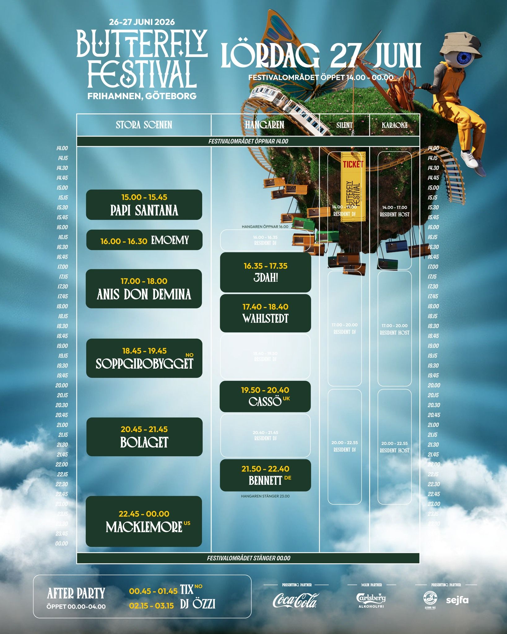 Saturday continues the momentum with Papi Santana, Anis Don Demina and Soppgirobygget setting the tone ahead of Bolaget, while international headliner Macklemore closes out the festival in a huge final set. Across the Hangaren stage, artists like Raaban, Young Earth Sauce, Casso and Bennett will keep energy levels high throughout both days.