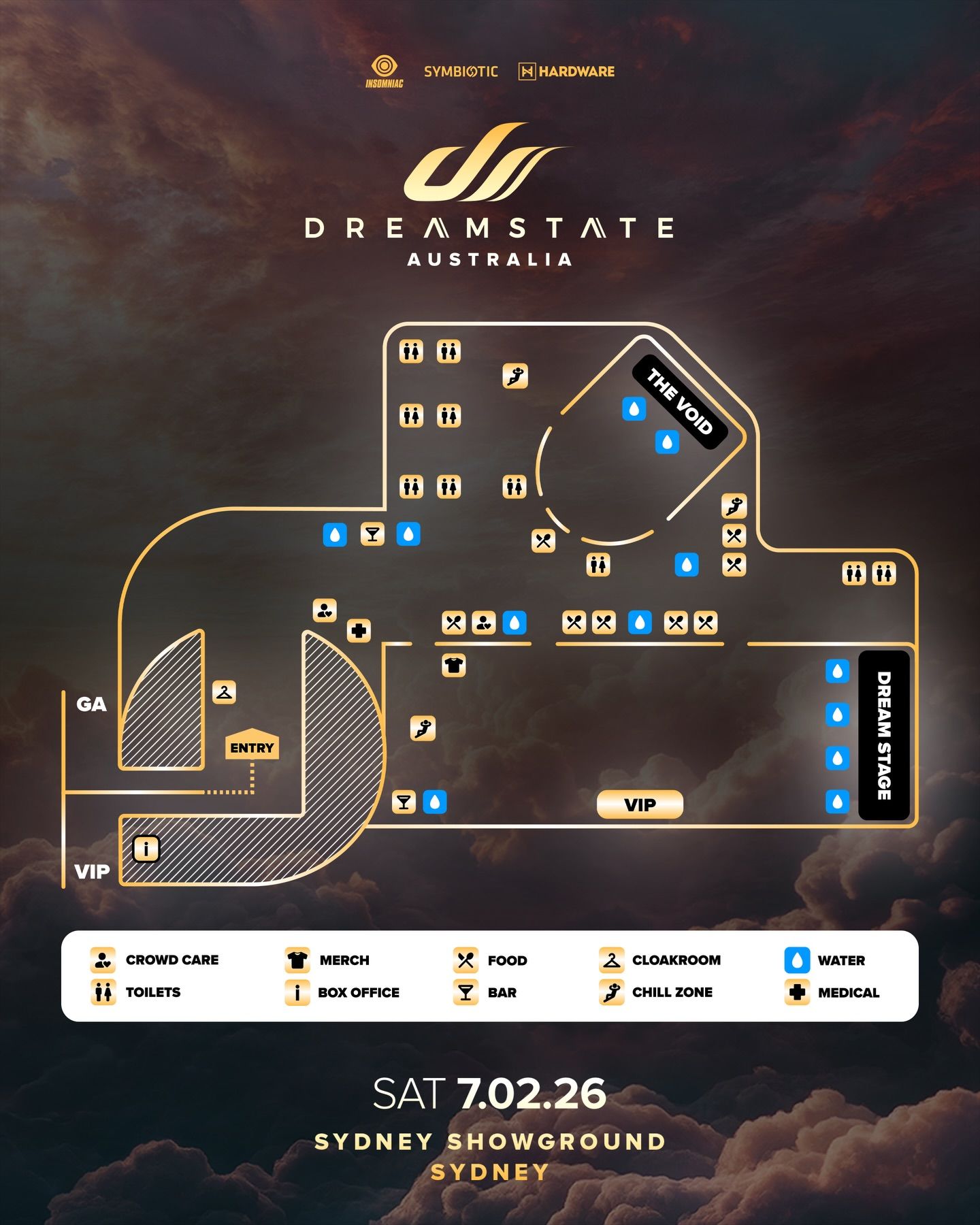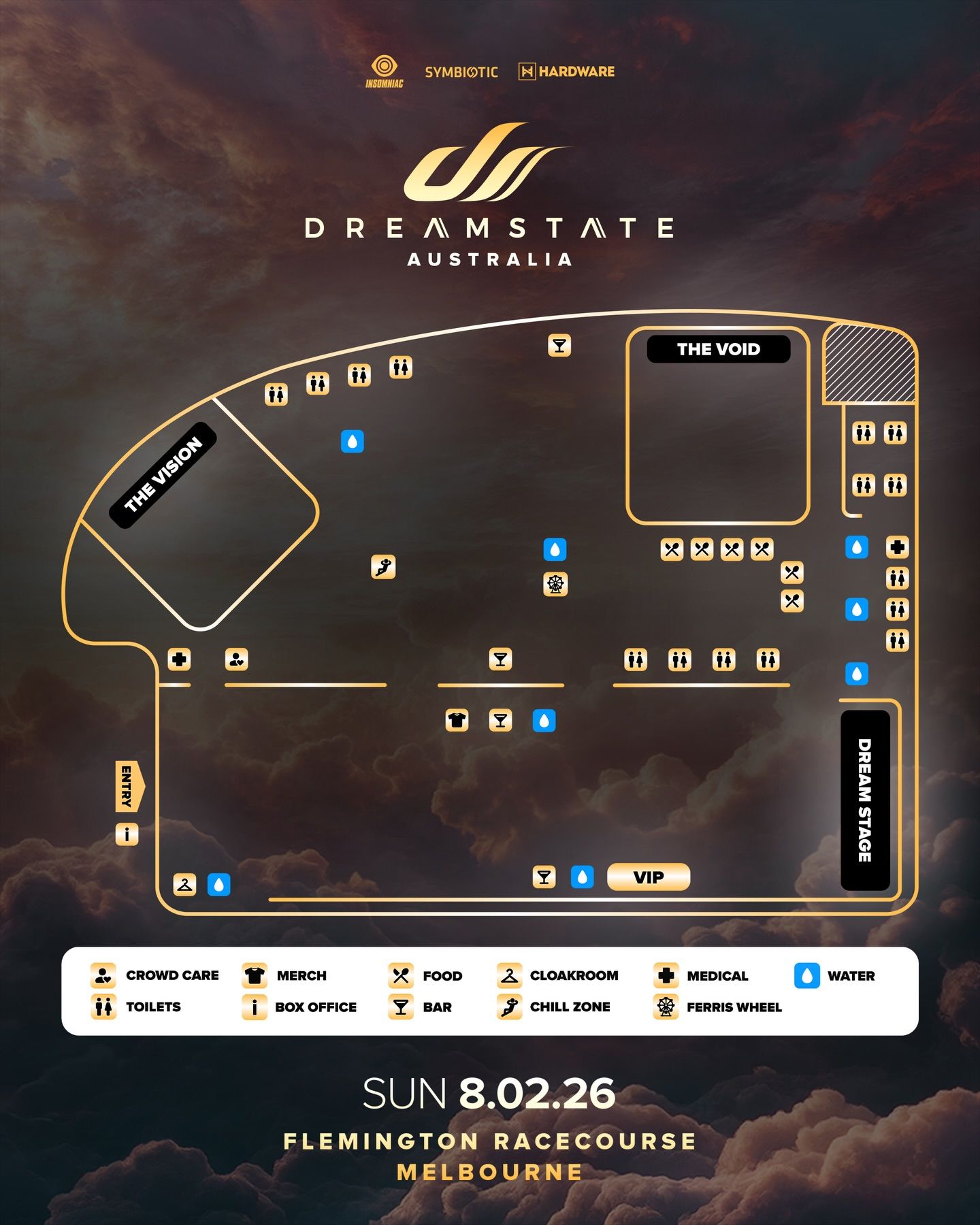 The Sydney edition will take place on 7th February, 2026 at Sydney Showground, followed by Melbourne on 8th February, 2026 at Flemington Racecourse. Both maps confirm the return of Dreamstate’s signature dual-stage setup, with the Dream Stage and The Void positioned to anchor the experience, supported by expansive bar areas, chill zones, merch, food vendors and clearly marked medical and crowd care services.