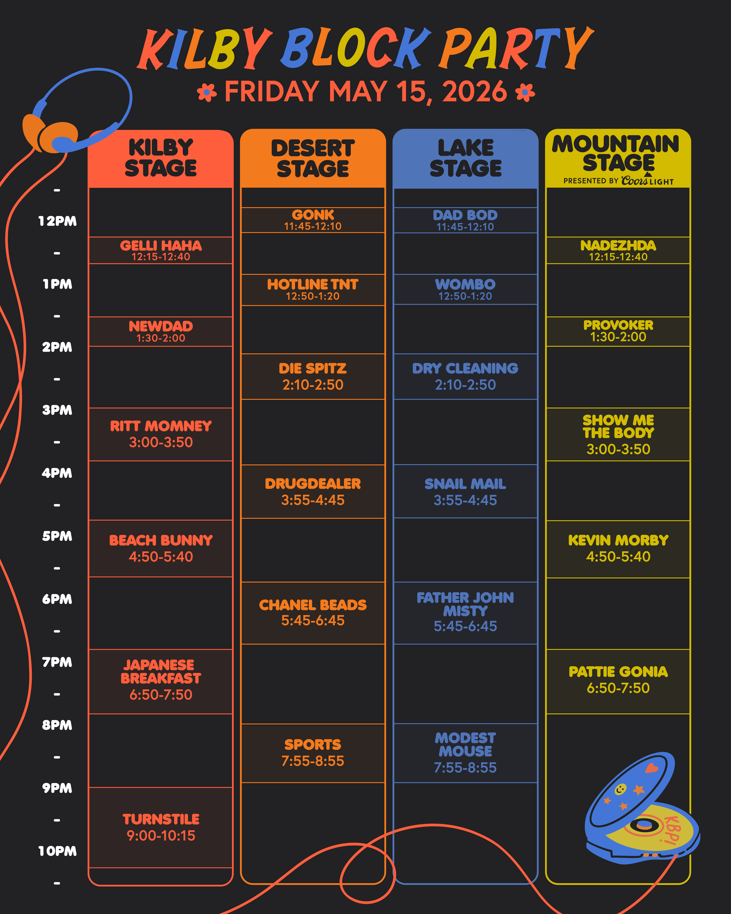 Friday’s schedule sees Turnstile close out the Kilby Stage, while Father John Misty, Modest Mouse and Japanese Breakfast deliver standout evening performances across the site. With artists like Snail Mail, Beach Bunny and Kevin Morby also featuring, the opening day offers a strong mix of established favourites and emerging talent across all four stages.