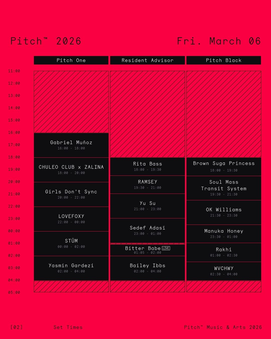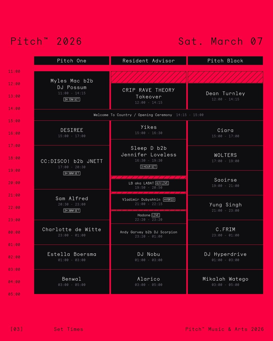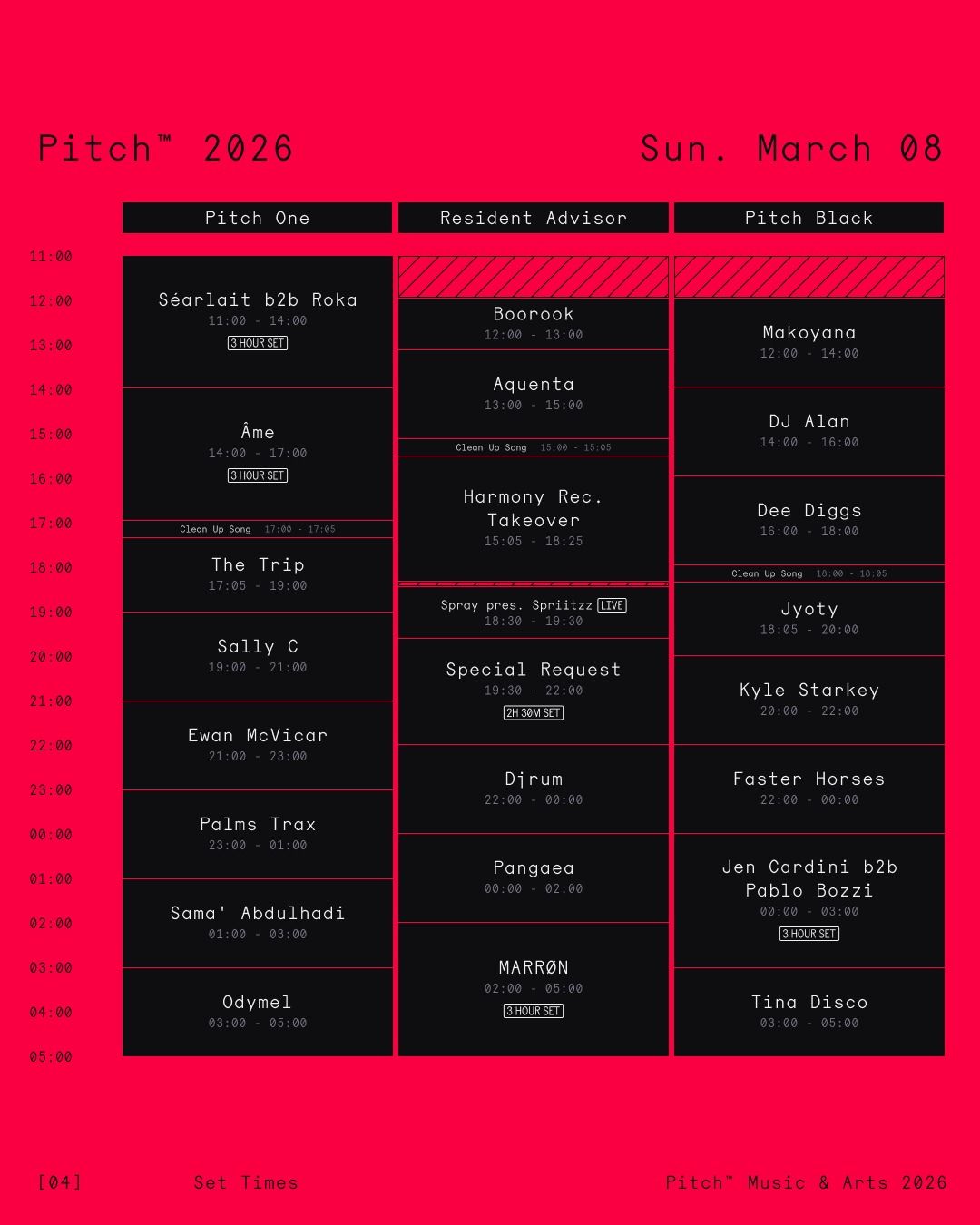 Sunday, 8th March is equally commanding, with Séarlait b2b Roka and Âme (DJ Set) leading into The Trip, Sally C and Ewan McVicar on Pitch One, while Special Request, DJ Alan, Faster Horses and MARRØN take control across the other arenas. The festival closes Monday, 9th March with Hannah D b2b Moopie, Eris Drew & Octo Octa and Job Jobse soundtracking the final stretch.