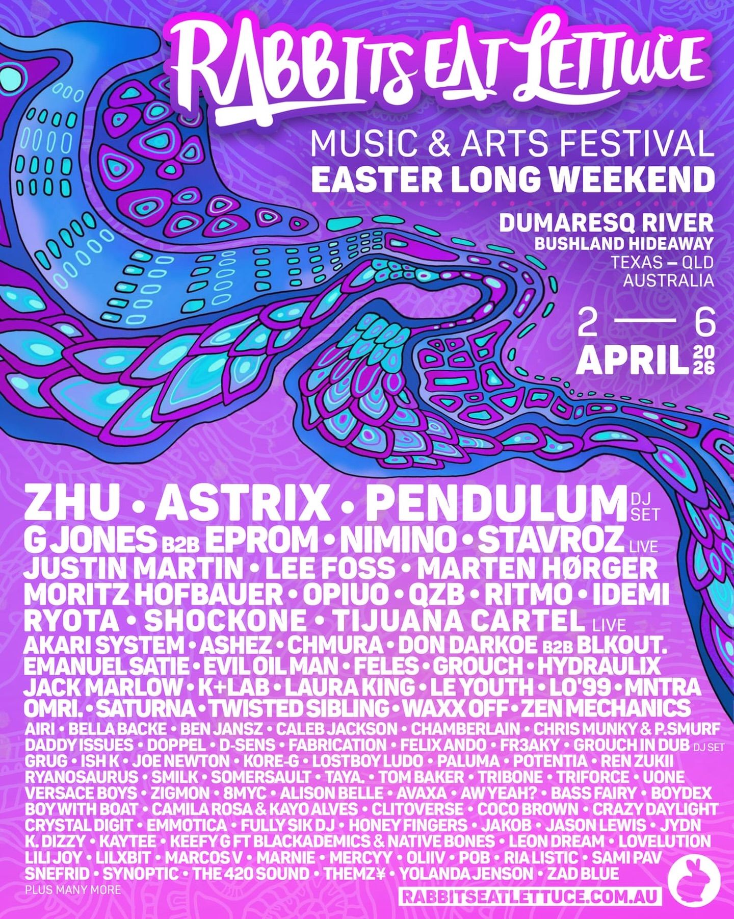 Rabbits Eat Lettuce has officially unveiled its full 2026 lineup, locking in one of the most ambitious Easter long weekend gatherings on the Australian festival calendar. Returning to its secluded Bushland Hideaway in Beebo, Queensland, the beloved bush doof will run from 2nd - 6th April, 2026, once again transforming the Dumaresq River surrounds into a five-day celebration of music, art and community immersed deep in nature.