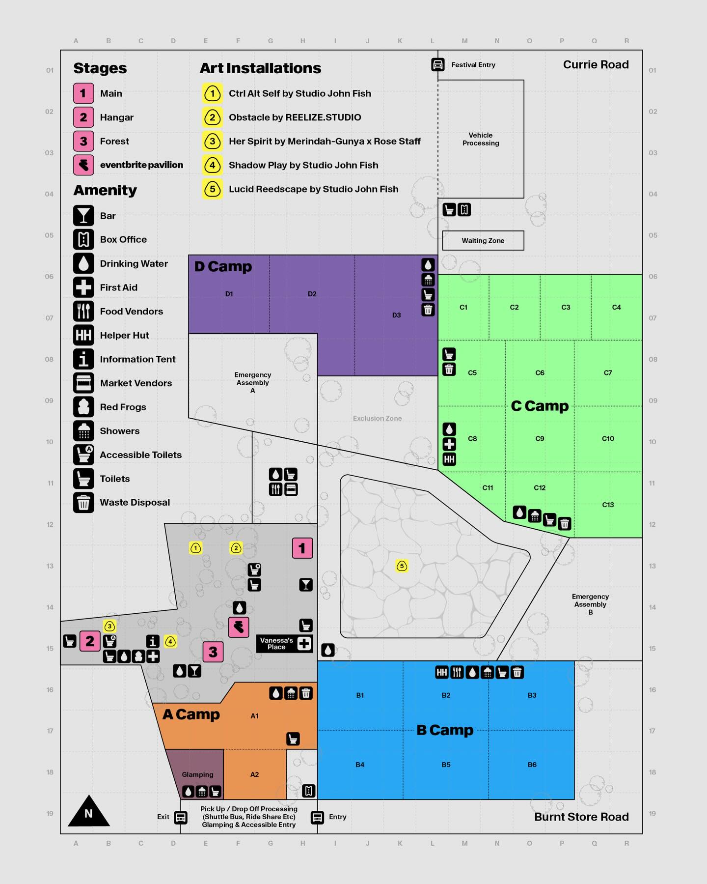 All four stages — Main, Hangar, Forest, and Eventbrite Pavilion — are centrally located between A Camp and the food and bar zones, ensuring easy access across the festival hub. Nearby, installations by Studio John Fish and REELIZE.STUDIO will bring the site to life with large-scale immersive artworks, including Ctrl Alt Self, Shadow Play, and the collaborative piece Her Spirit. Market vendors, food stalls, drinking water points, and accessible facilities are well distributed around the main arena.