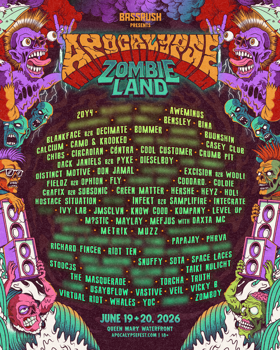 Apocalypse: Zombieland has revealed the phase one lineup for its 2026 edition, set to take over the Queen Mary Waterfront in Long Beach, California on 19th - 20th June, 2026. Presented by Insomniac’s Bassrush brand, the festival will return for its fourth year with more than 80 artists performing across four stages, showcasing the evolving spectrum of bass music.