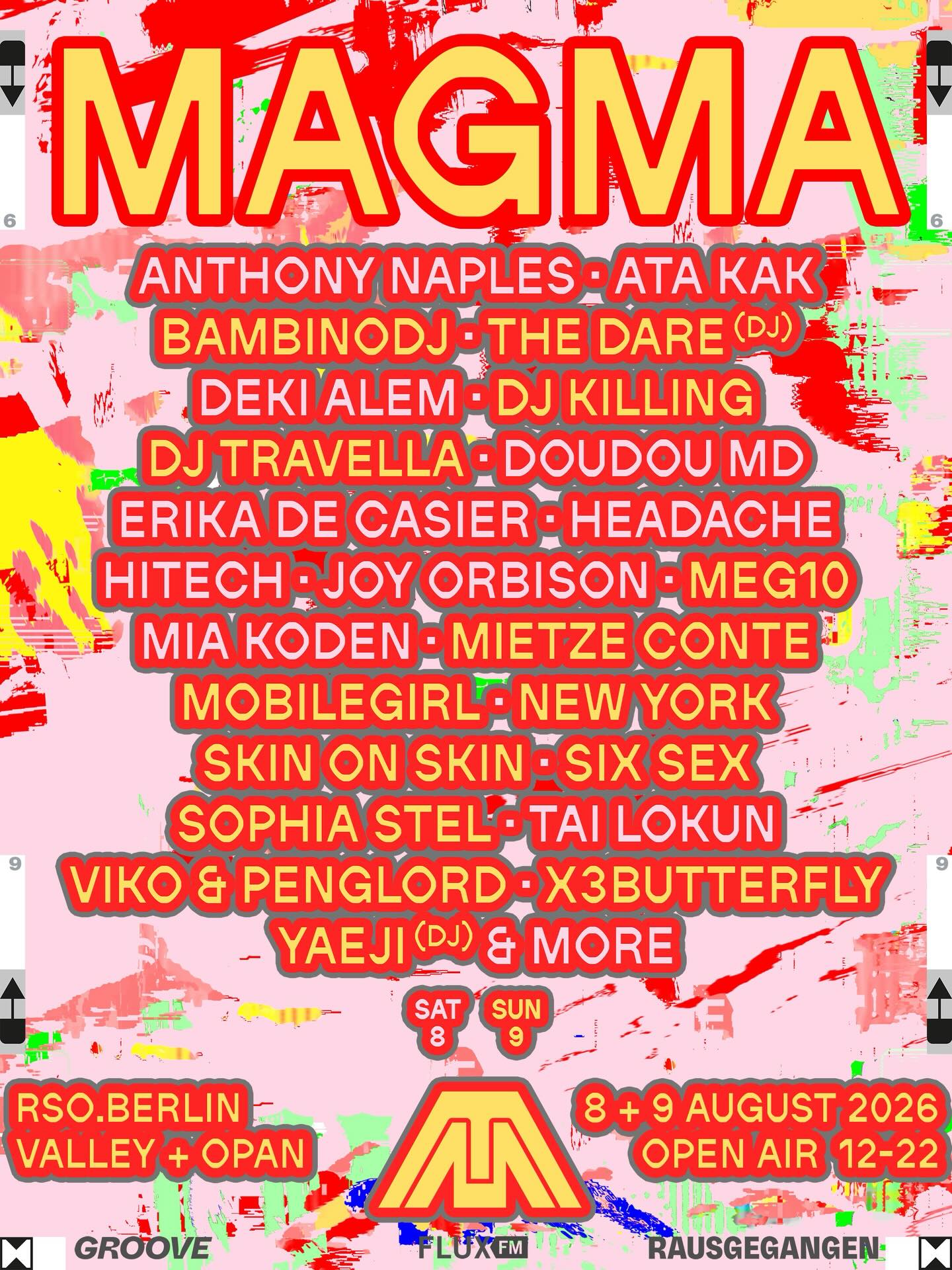 Further depth comes from Ata Kak, Bambinodj, Deki Alem, DJ Killing, Meg10, Mia Koden, Mietze Conte, Mobilegirl, New York, Six Sex, Sophia Stel, Tai Lokun, Viko & Penglord and X3Butterfly. The diverse roster highlights MAGMA’s curatorial edge, spotlighting emerging innovators alongside established tastemakers across two immersive open air days in Berlin.