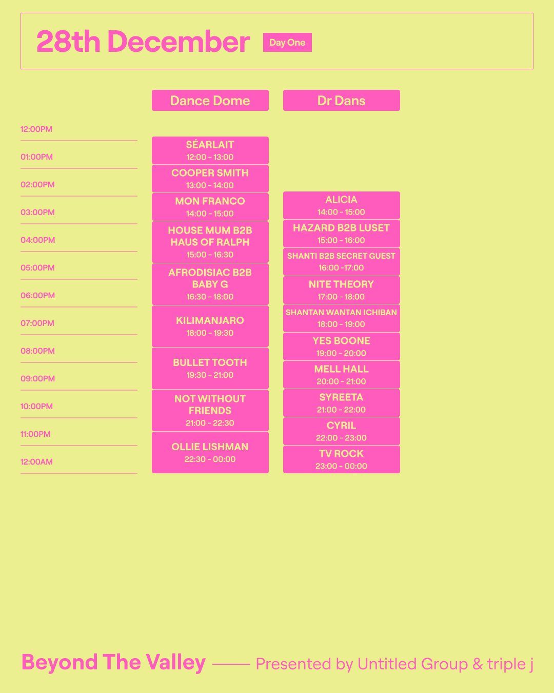 Opening day (28th December) kicks off with Dance Dome and Dr Dans stage takeovers featuring Ollie Lishman, Not Without Friends, and Bullet Tooth, while DJ favourites like TV Rock, Syreeta, and Alicia take over Dr Dans from afternoon to midnight. The main Valley Stage officially launches on 29th December, with performances from Mallrat, JoJo (in her only Australian appearance), 070 Shake, and a late-night headline set from Addison Rae.