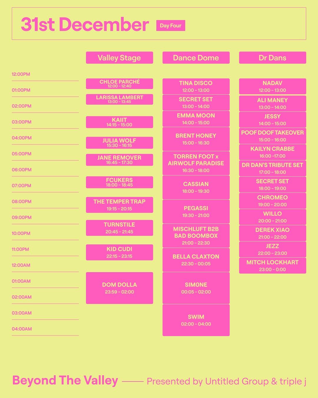 Across the weekend, highlights include Luude ringing in 2026 at midnight on New Year’s Eve, Kid Cudi on just before him, and standout moments from Turnstile, The Temper Trap, Channel Tres, and Spacey Jane. Fans of electronic music will be treated to a stacked Dance Dome lineup including I Hate Models, DJ Heartstring, Patrick Mason, VTSS, and KETTAMA.