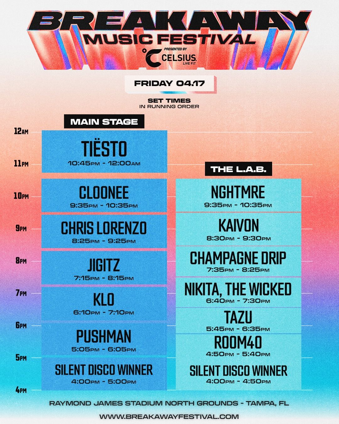 Friday’s schedule is led by Tiësto, closing out the Main Stage after performances from Cloonee, Chris Lorenzo and Jigitz, while NGHTMRE tops The L.A.B. stage alongside Kaivon and Champagne Drip. The opening day balances house and bass sounds, setting the tone for a high-energy start in Tampa.