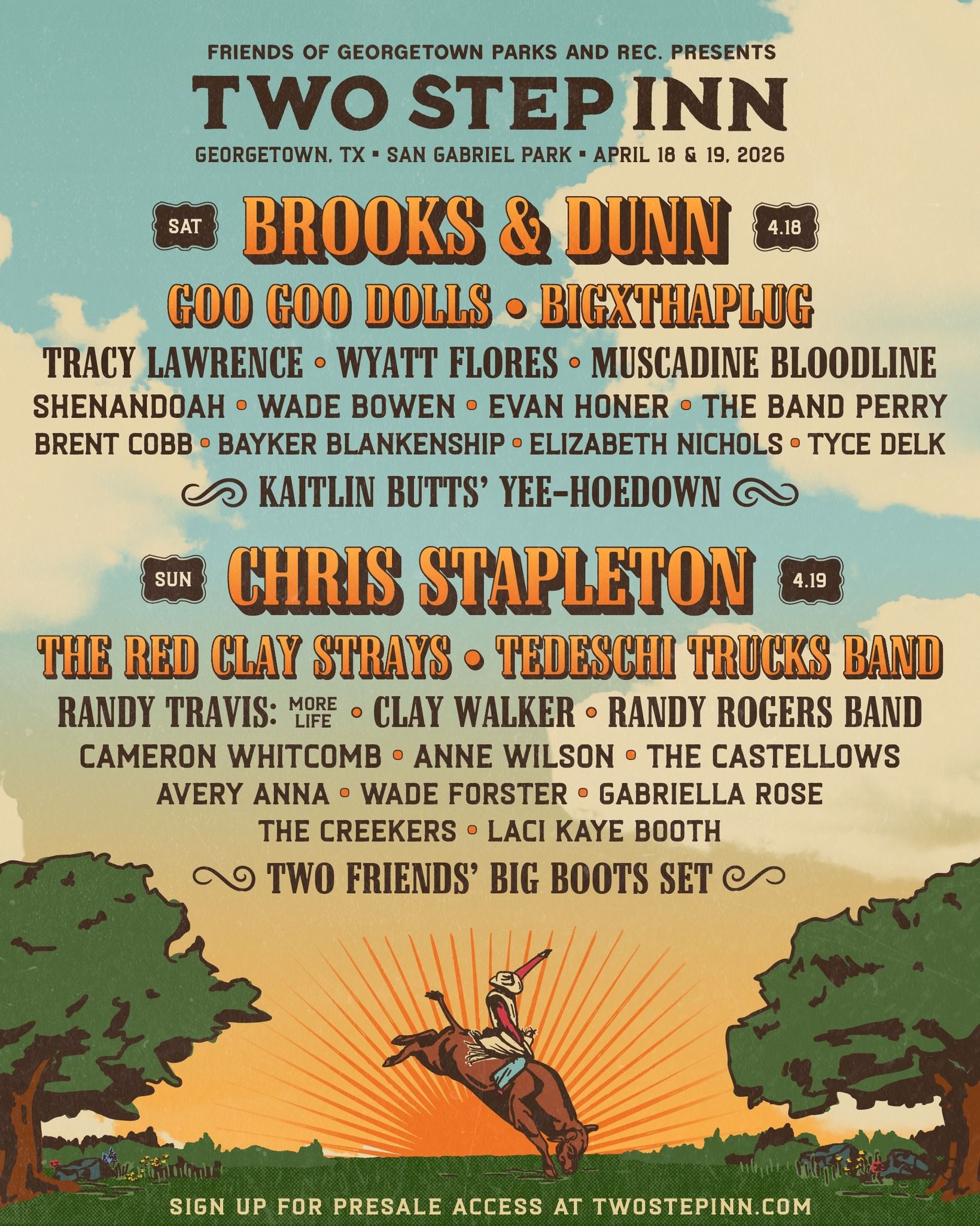 Country music fans, dust off your boots — Two Step Inn is back for its fourth edition, returning to the scenic San Gabriel Park in Georgetown, Texas on 18th and 19th April, 2026. Leading the lineup this year are modern country icon Chris Stapleton and legendary duo Brooks & Dunn, both set to headline a weekend that promises southern sounds, honky-tonk spirit and Texas pride.