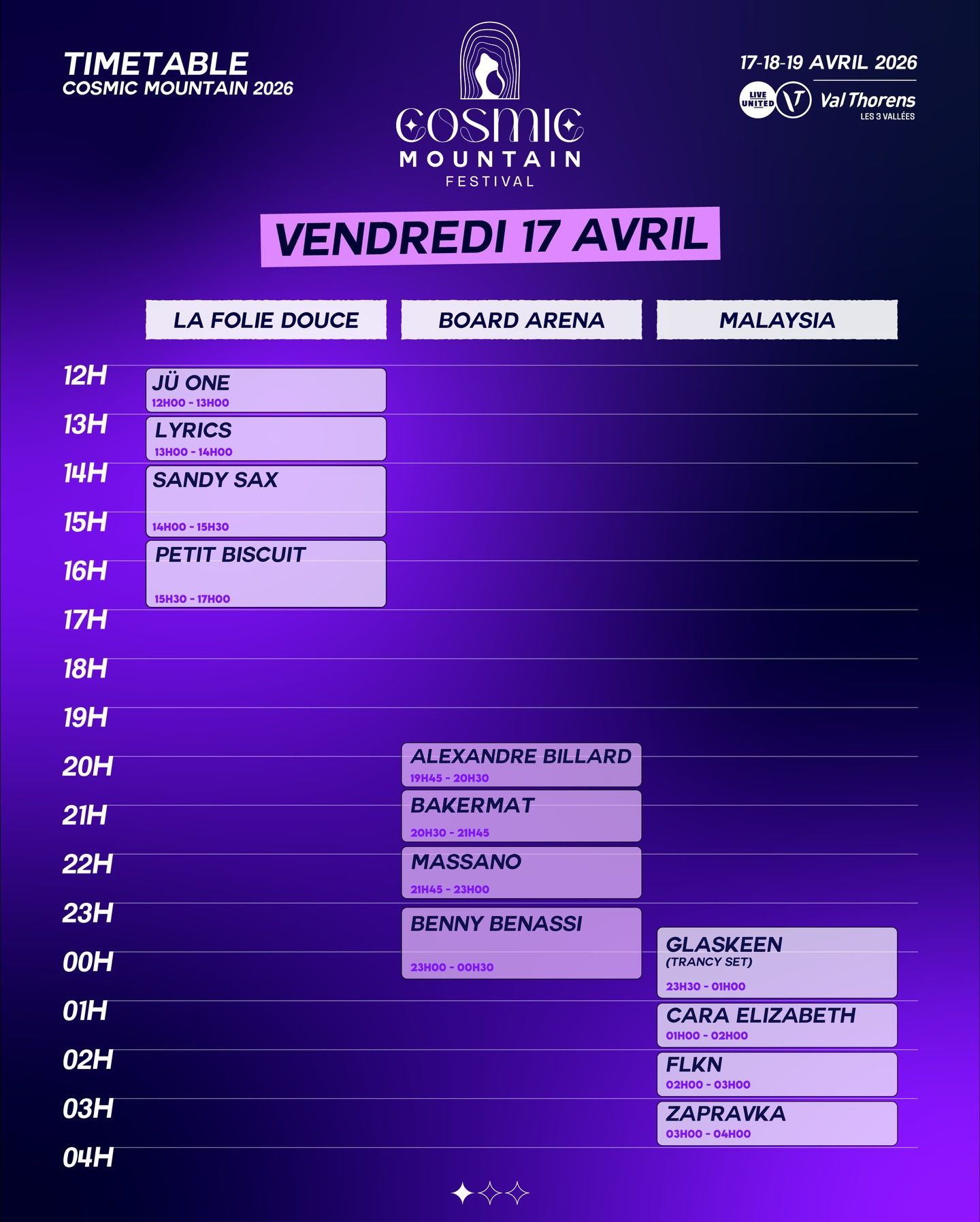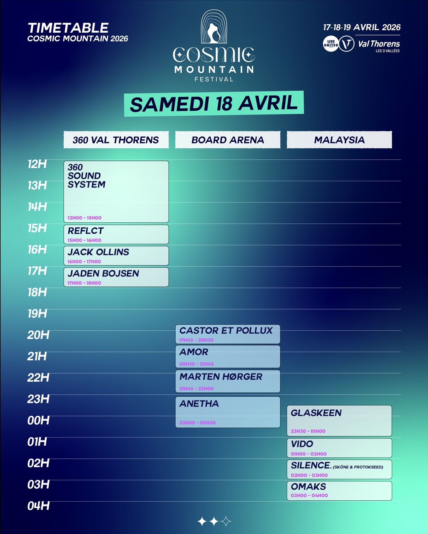 Saturday ramps things up with a panoramic daytime takeover at 360 Val Thorens, featuring 360 Sound System, Reflct, Jack Ollins and Jaden Bojsen. As night falls, Board Arena hosts Castor & Pollux, Amor, Marten Hørger and Anetha, while Malaysia delivers an intense underground run with Glaskeen, Vido, Silence. and Omaks.