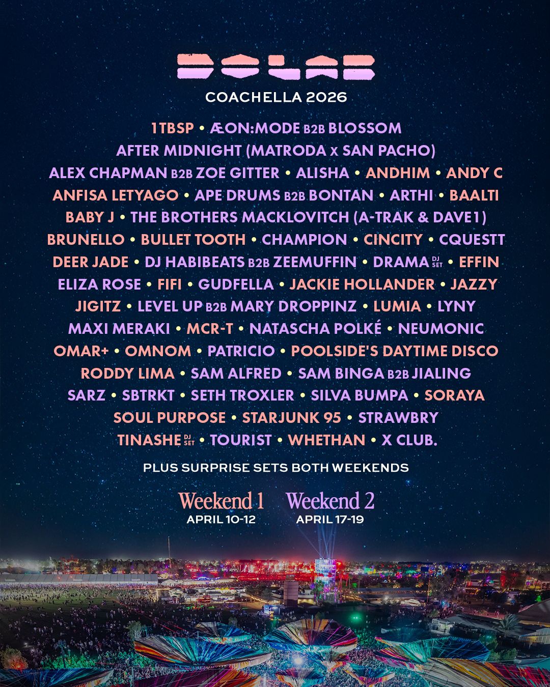 Weekend One highlights include drum and bass icon Andy C, Italian techno force Anfisa Letyago, bass-forward house favourite OMNOM, Poolside’s Daytime Disco, Starjunk 95, Whethan and a DJ set from multi-platinum R&B disruptor Tinashe. The opening weekend also leans into club culture and future-facing sounds with sets from MCR-T, Omar+, Deer Jade, jigitz, FIFI and Jackie Hollander, reinforcing Do LaB’s reputation for championing the next wave.