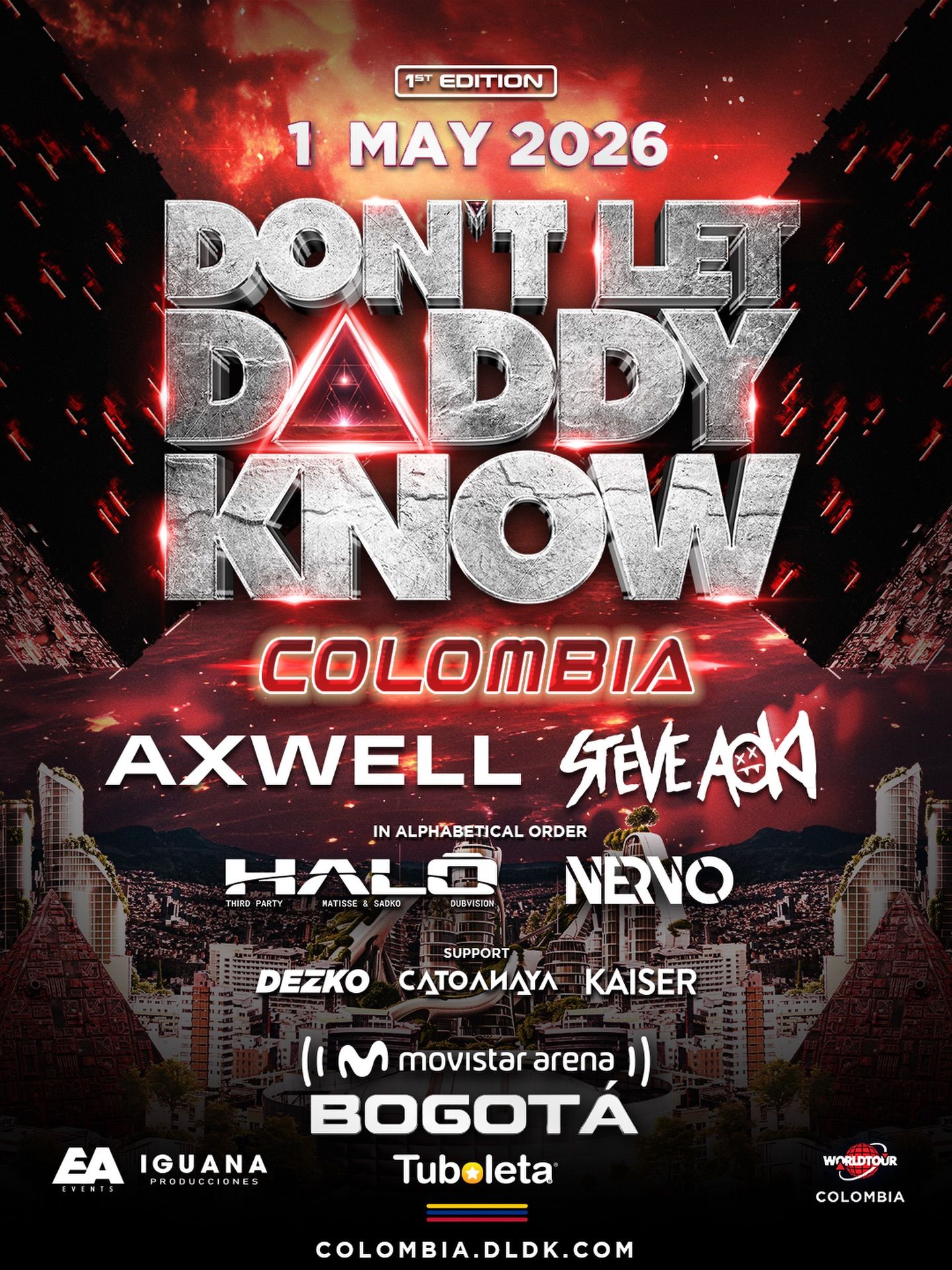 The Bogota show forms part of the wider Don’t Let Daddy Know World Tour, a brand synonymous with explosive visuals, cutting-edge stage design and peak-time anthem selections. Hosting the event at Movistar Arena positions the festival firmly within Colombia’s growing large-scale electronic music market, signalling confidence in the local appetite for premium EDM experiences.