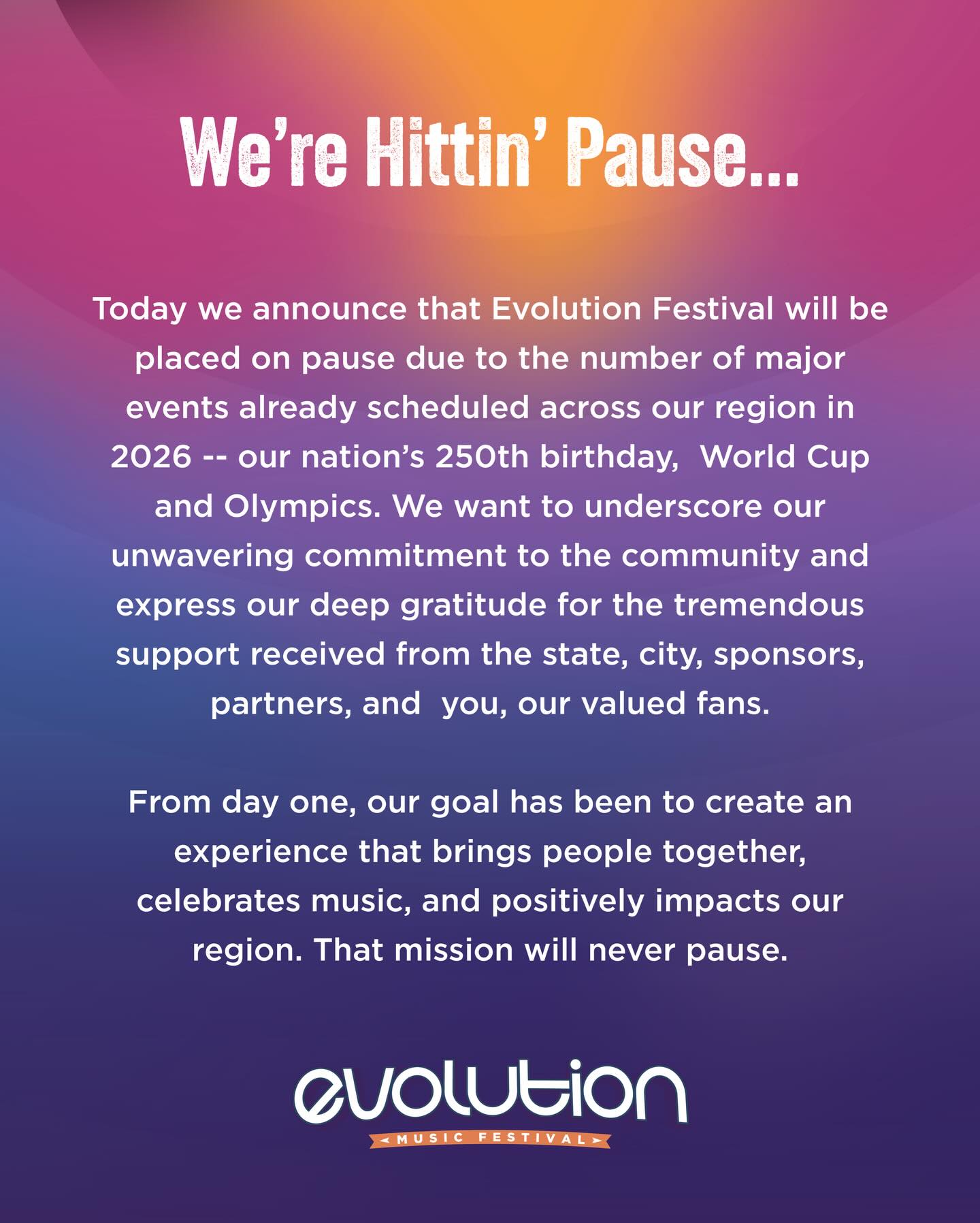 Organisers of Evolution Festival have confirmed the event will pause in 2026, citing a crowded national calendar that includes the USA’s 250th birthday celebrations, the FIFA World Cup, and the Summer Olympics. The announcement comes just months after the successful 2025 edition, held on 27th–28th September at Forest Park in Saint Louis, Missouri.