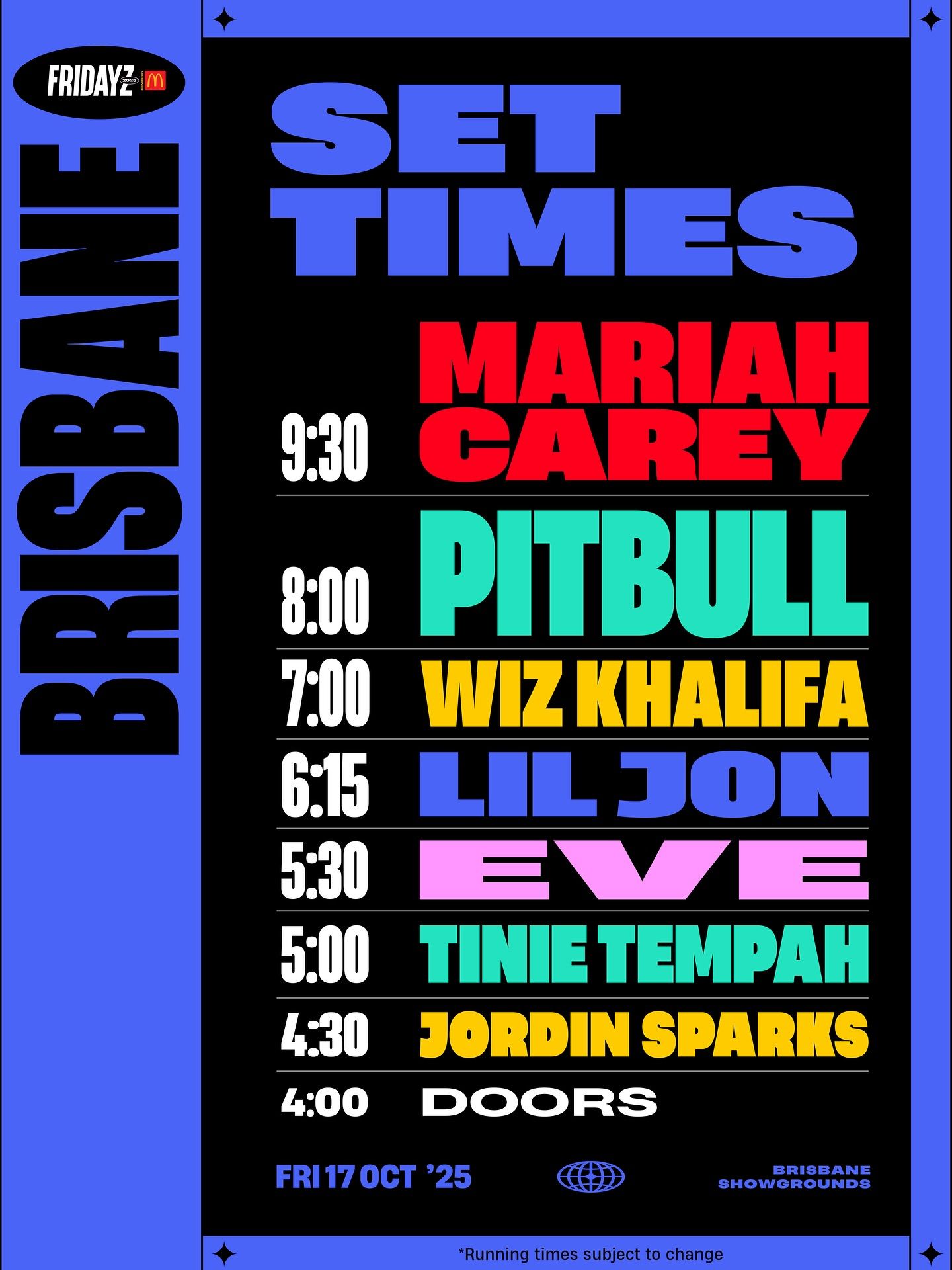 With the Brisbane leg officially sold out, organisers have just dropped the full set times and festival map for Fridayz Live 2025, kicking off this Friday, 17th October at Brisbane Showgrounds. The stacked lineup features pop and hip-hop royalty Mariah Carey, Pitbull, Wiz Khalifa, Lil Jon, Eve, Tinie Tempah, and Jordin Sparks, all performing on one massive stage for an unforgettable night of nostalgic hits and high-energy performances.