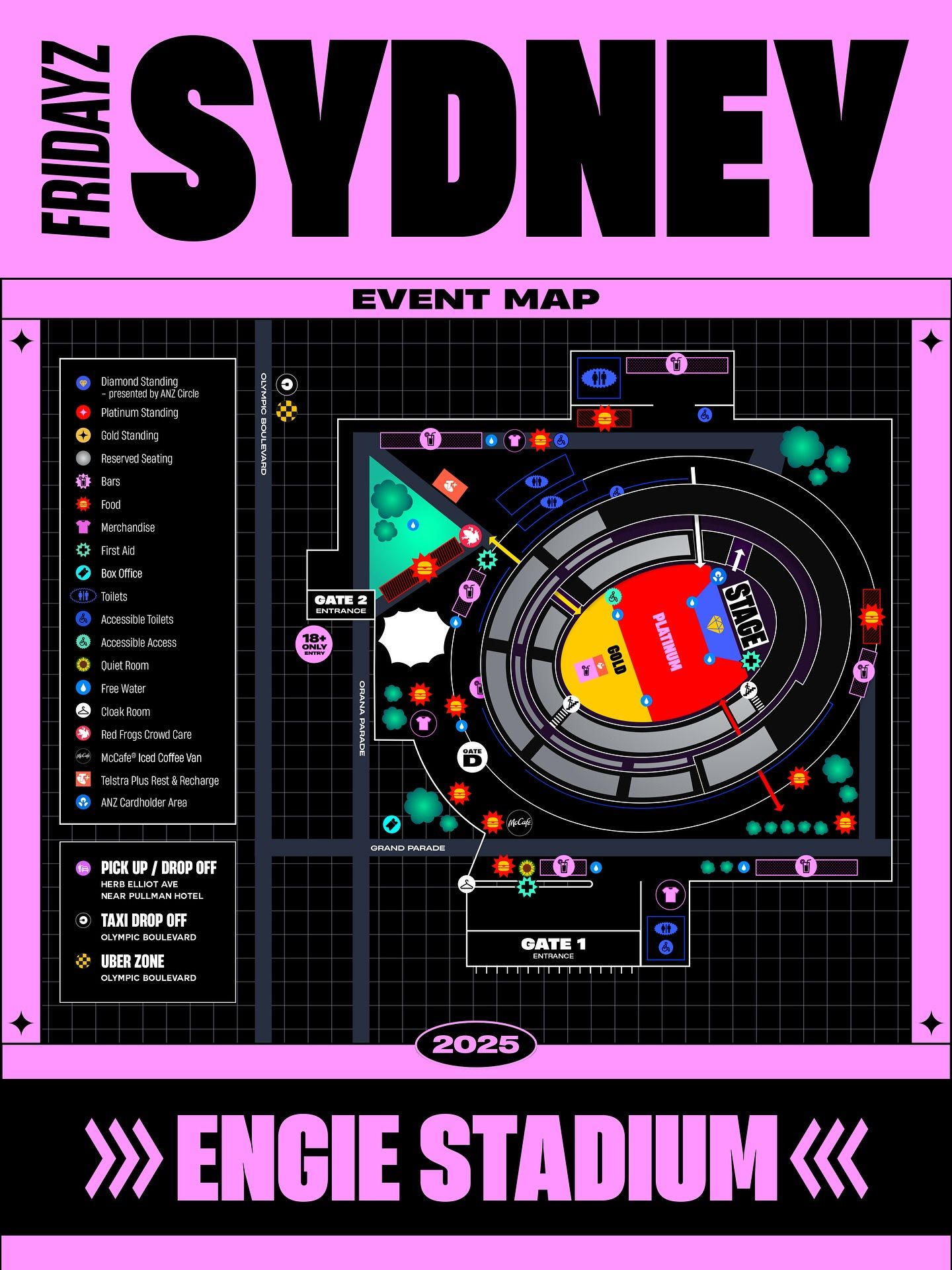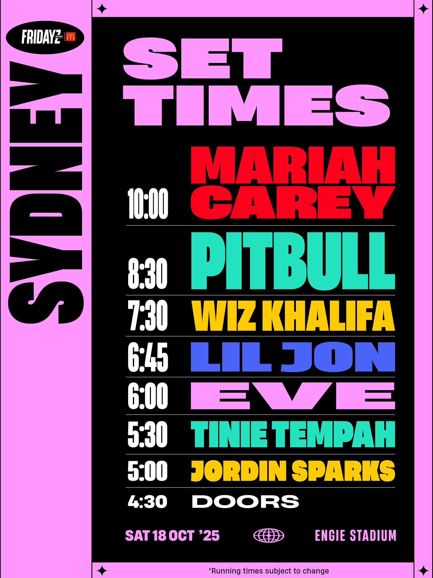 The countdown is on for Fridayz Live 2025 Sydney, and organisers have just released the full set times and official site map for this Saturday’s massive event at ENGIE Stadium. Taking place on 18th October, the pop, R&B and hip-hop spectacular will feature some of the biggest names in music history including Mariah Carey, Pitbull, Wiz Khalifa, Lil Jon, Eve, Tinie Tempah, and Jordin Sparks.