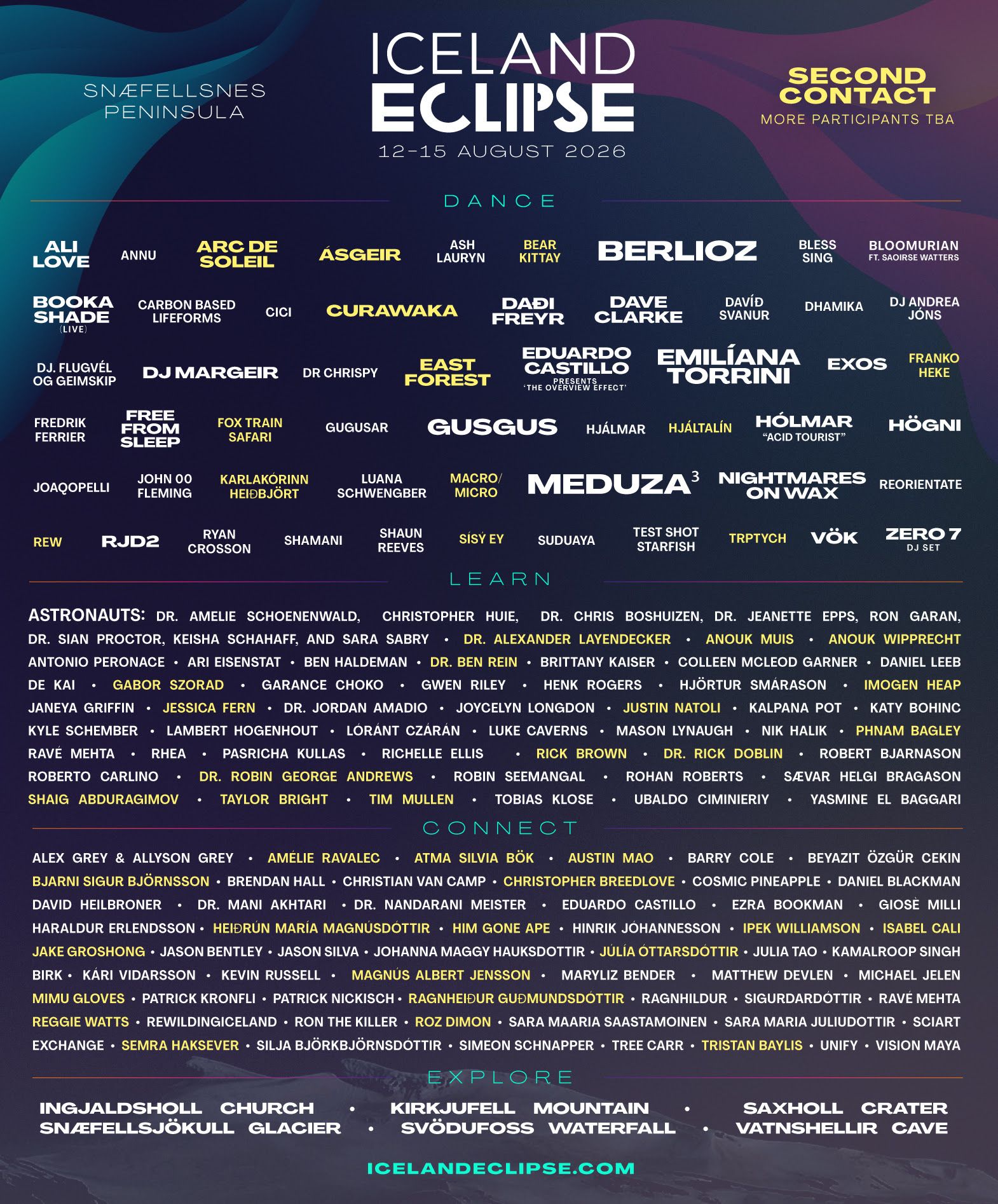 The new lineup joins previously announced acts such as MEDUZA³, Berlioz, Daði Freyr, Booka Shade, and Nightmares on Wax, along with astronauts from NASA, SpaceX, Blue Origin, and Virgin Galactic, plus innovation leaders from the UN, Space for Humanity, and Eden Foundation. With only 3,333 guests, Iceland Eclipse promises an immersive and intimate experience set against volcanoes, glaciers, waterfalls, and black sand beaches.