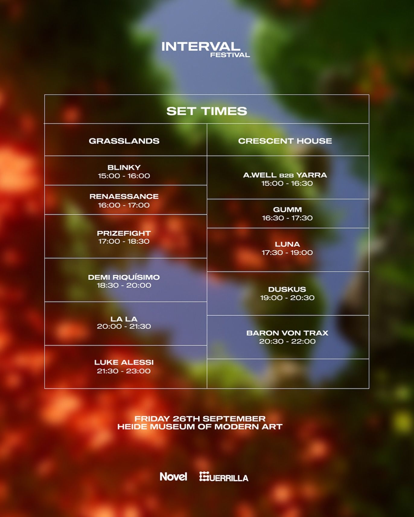 Set times have officially landed for the debut edition of Interval Festival, taking place this Friday, 26th September, 2025 at the Heide Museum of Modern Art in Victoria. The one-day event promises an intimate yet immersive experience, blending cutting-edge electronic music with a stunning outdoor art space.
