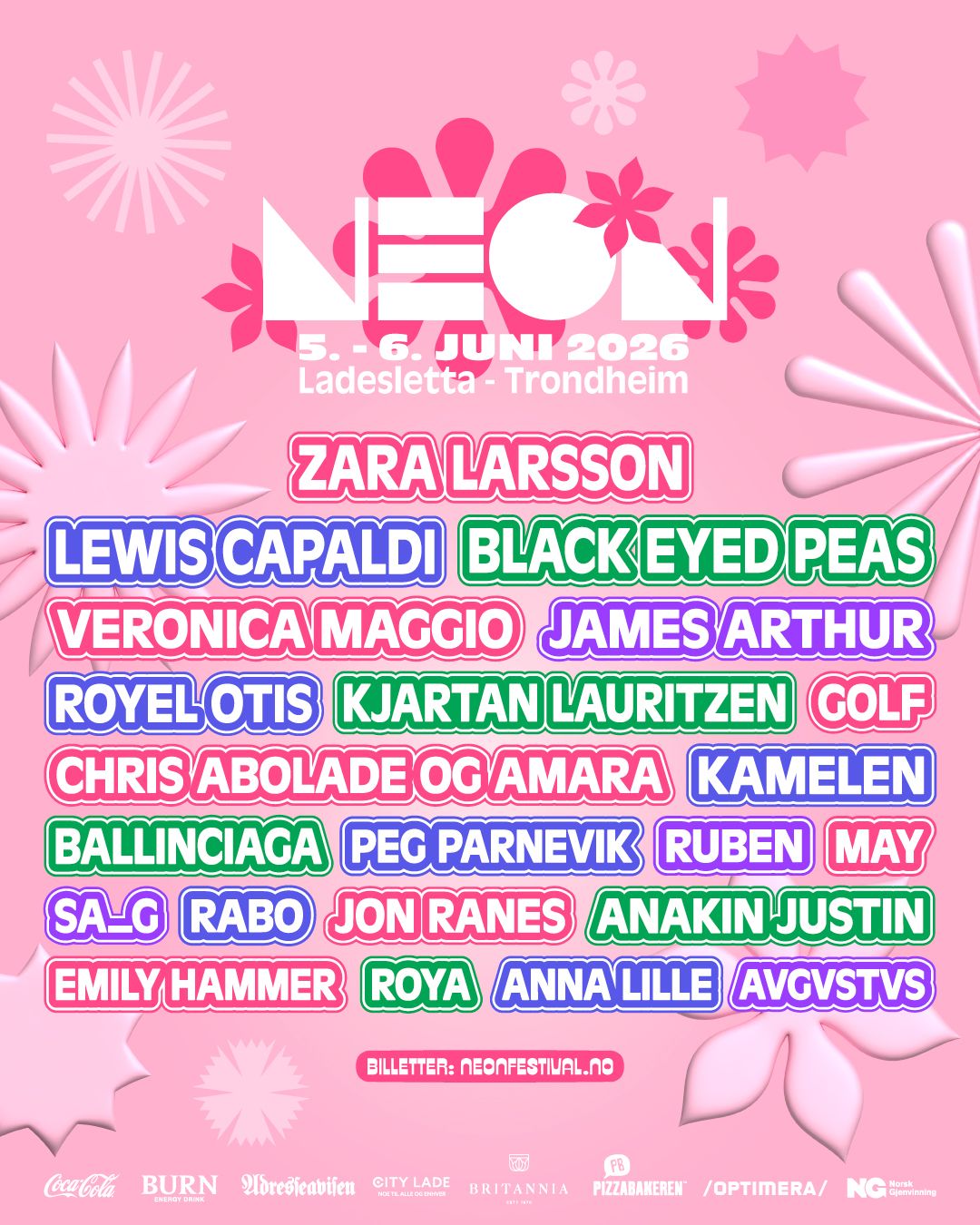 They join an impressive 2026 line-up already featuring Zara Larsson, Lewis Capaldi and Black Eyed Peas, alongside Veronica Maggio, Kamelen, Chris Abolade og Amara, Ballinciaga and more. The expanded bill reinforces Neon Festival’s position as a major player in the Nordic summer calendar, balancing global pop heavyweights with the region’s most exciting voices.