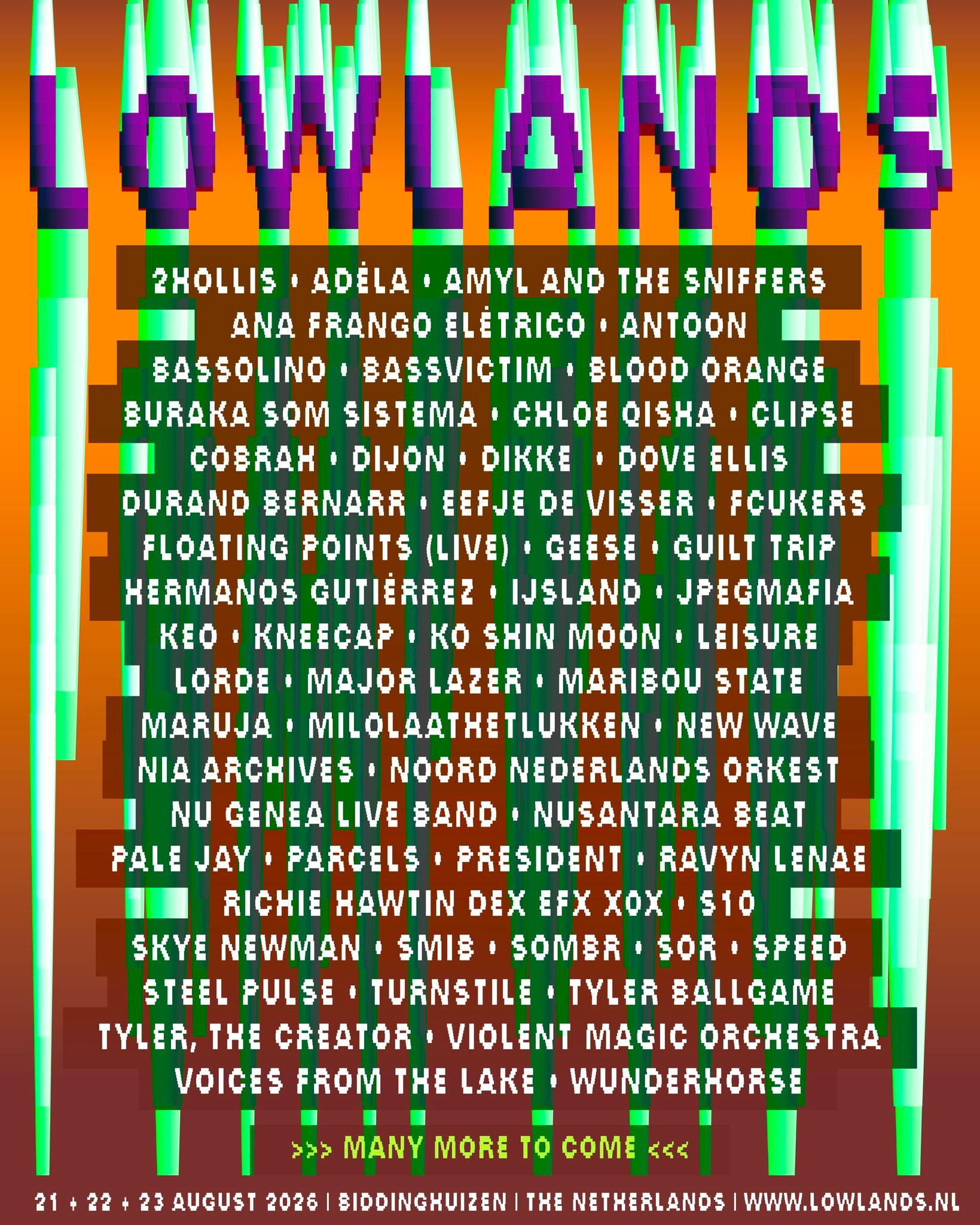 Leading the initial announcement are Tyler, The Creator and Lorde, joined by Major Lazer, Turnstile, Blood Orange, JPEGMAFIA and Amyl & The Sniffers. The first wave also features forward-thinking electronic and dance acts including Floating Points performing live, Richie Hawtin with his DEX EFX XOX show, Maribou State, Nu Genea with a full live band, Nia Archives and Voices From The Lake, reinforcing Lowlands’ reputation for adventurous programming.
