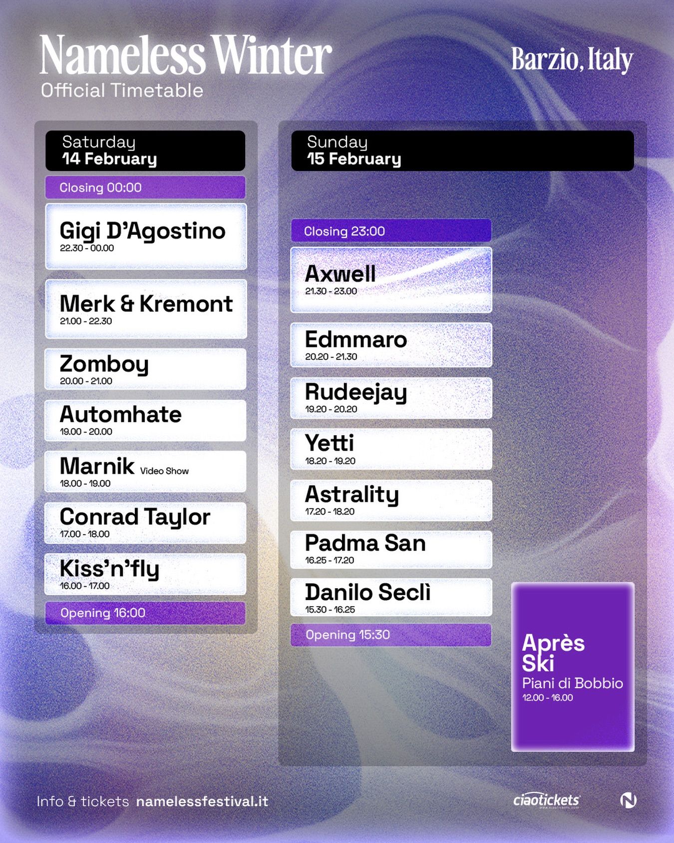Sunday sees Swedish superstar Axwell take top billing, closing the festival from 9:30pm to 11pm. The final day also features Edmmaro, Rudeejay, Yetti and Astrality, alongside Danilo Secli and Padma San in the afternoon slots. An extended après-ski session runs daily from midday until 4pm at Piani di Bobbio, bridging the slopes and the main arena.