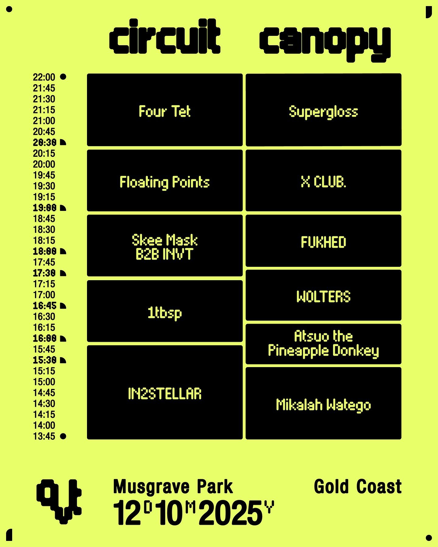 Leading the bill are global heavyweights Four Tet, Floating Points, and Skee Mask, each bringing their genre-defying sound to Queensland for a rare open-air appearance. Local heroes X CLUB., 1tbsp, and IN2STELLAR will keep energy levels high, alongside international innovators like INVT, Fukhed, and the eccentric live stylings of Atsuo the Pineapple Donkey.