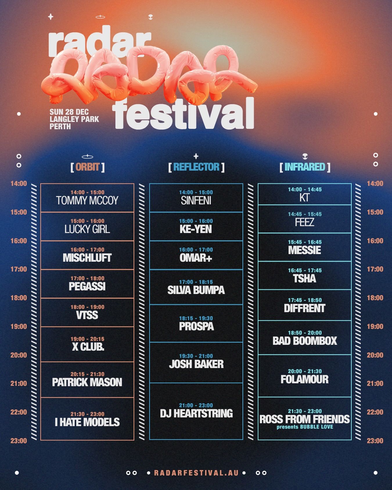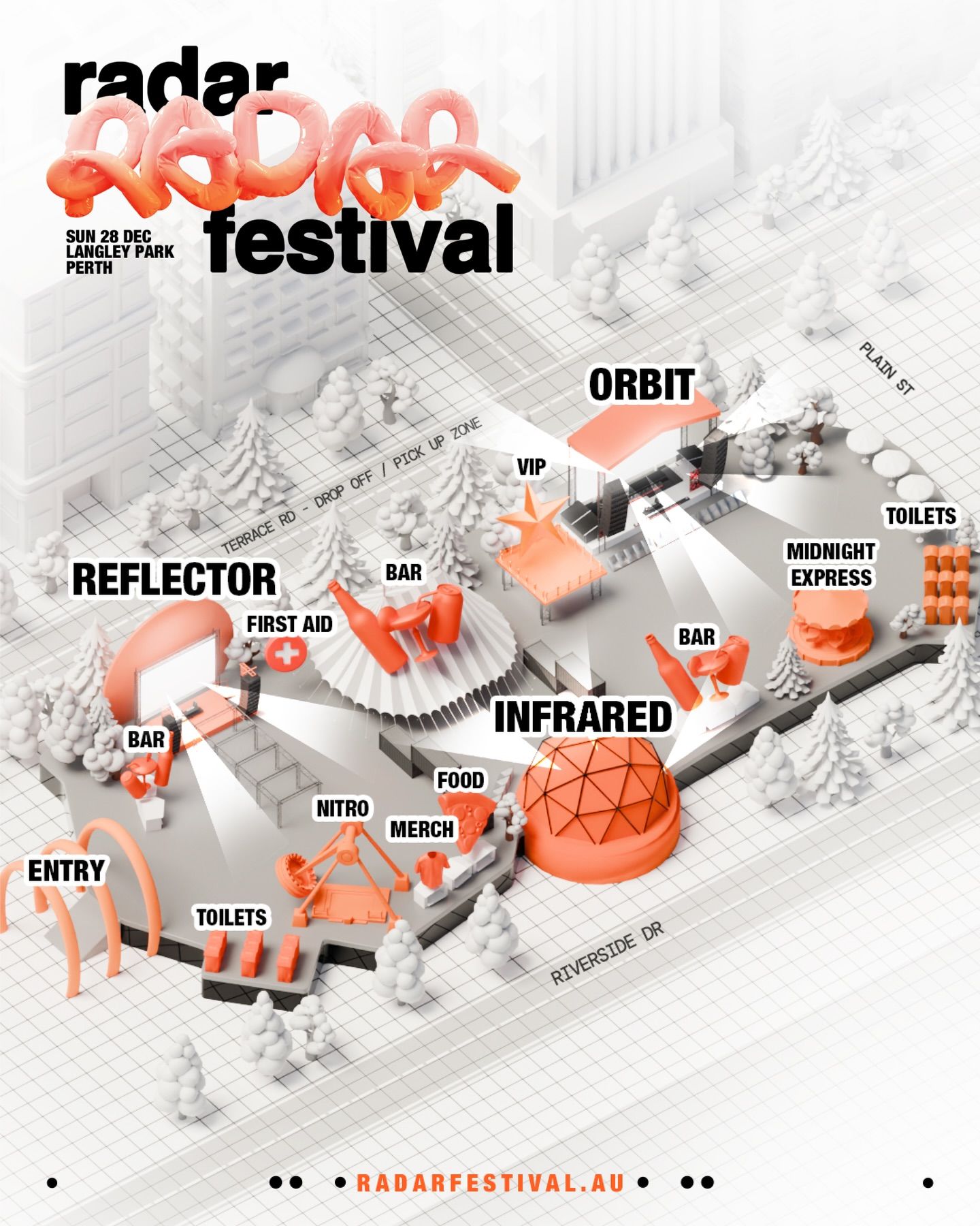 With anticipation building for its return to Langley Park, Radar Festival has unveiled the full set times and official site map for its 2025 edition, locked in for Sunday 28th December in Perth. The single-day event is set to deliver a high-energy day of cutting-edge electronic music, featuring top-tier international names and local favourites across three immersive stages: Orbit, Reflector, and Infrared.