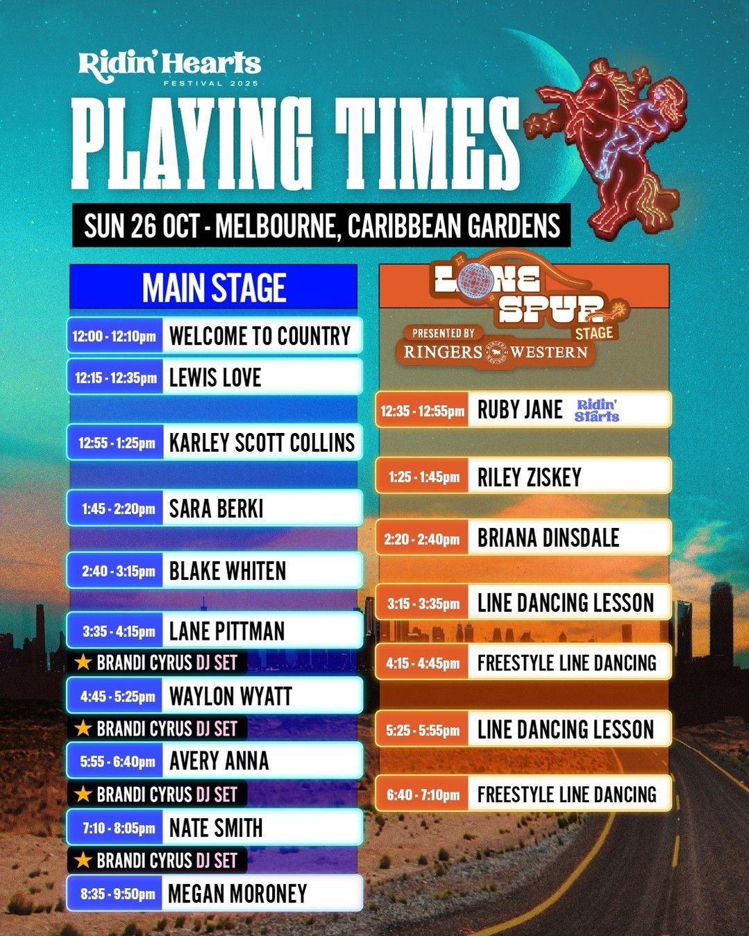 The countdown is on for Ridin' Hearts Festival 2025, with organisers officially releasing the set times for this year’s two-day country music celebration. Taking place on 25th October in Sydney and 26th October in Melbourne, fans can now start planning their day and locking in who they’ll be two-stepping to at both the Sydney Showground and Caribbean Gardens.
