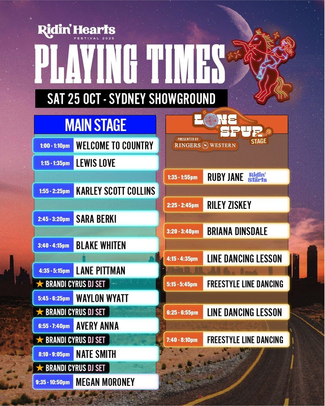 Now that the full timetable is available, fans are encouraged to download the schedule and plan ahead for either the Sydney or Melbourne leg. With Ridin’ Hearts continuing to grow as Australia’s premier country music day festival, this year’s event promises a smooth ride from start to finish.