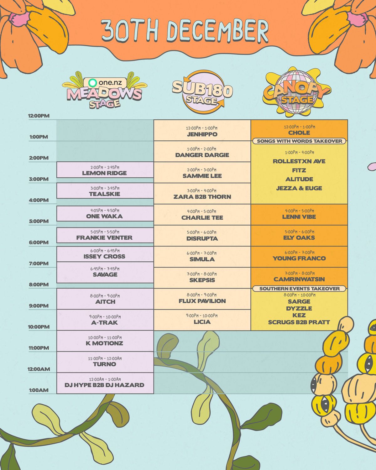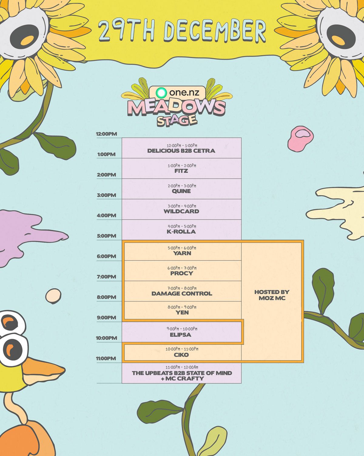 The festival kicks off on 29th December with high-energy sets from Ciko, Procy, Wildcard, Yen, and a massive late-night finale featuring The Upbeats B2B State of Mind with MC Crafty. Friday also sees Elipsa, K-Rolla, and Moz MC holding it down at the Meadows Stage for a strong New Zealand-heavy opening day.