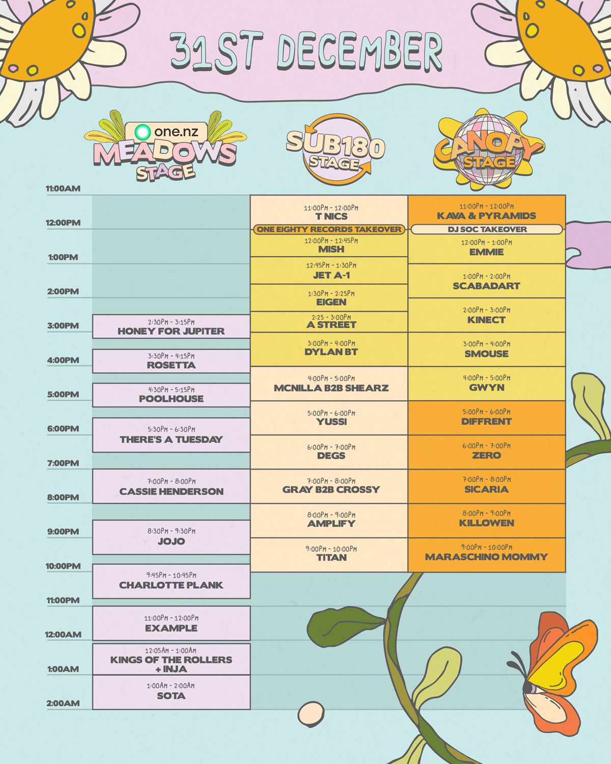 New Year’s Eve is stacked from start to finish. Example, Charlotte Plank, JoJo, Cassie Henderson, and There's A Tuesday lead the Meadows Stage, while Kings of the Rollers + Inja and Sota deliver the final late-night blow. Over at Sub180 and Canopy, catch highlight sets from Titan, Maraschino Mommy, Degs, Yussi, Scabadart, and more. With all stages now timed and ready, festivalgoers can begin mapping out their perfect weekend.