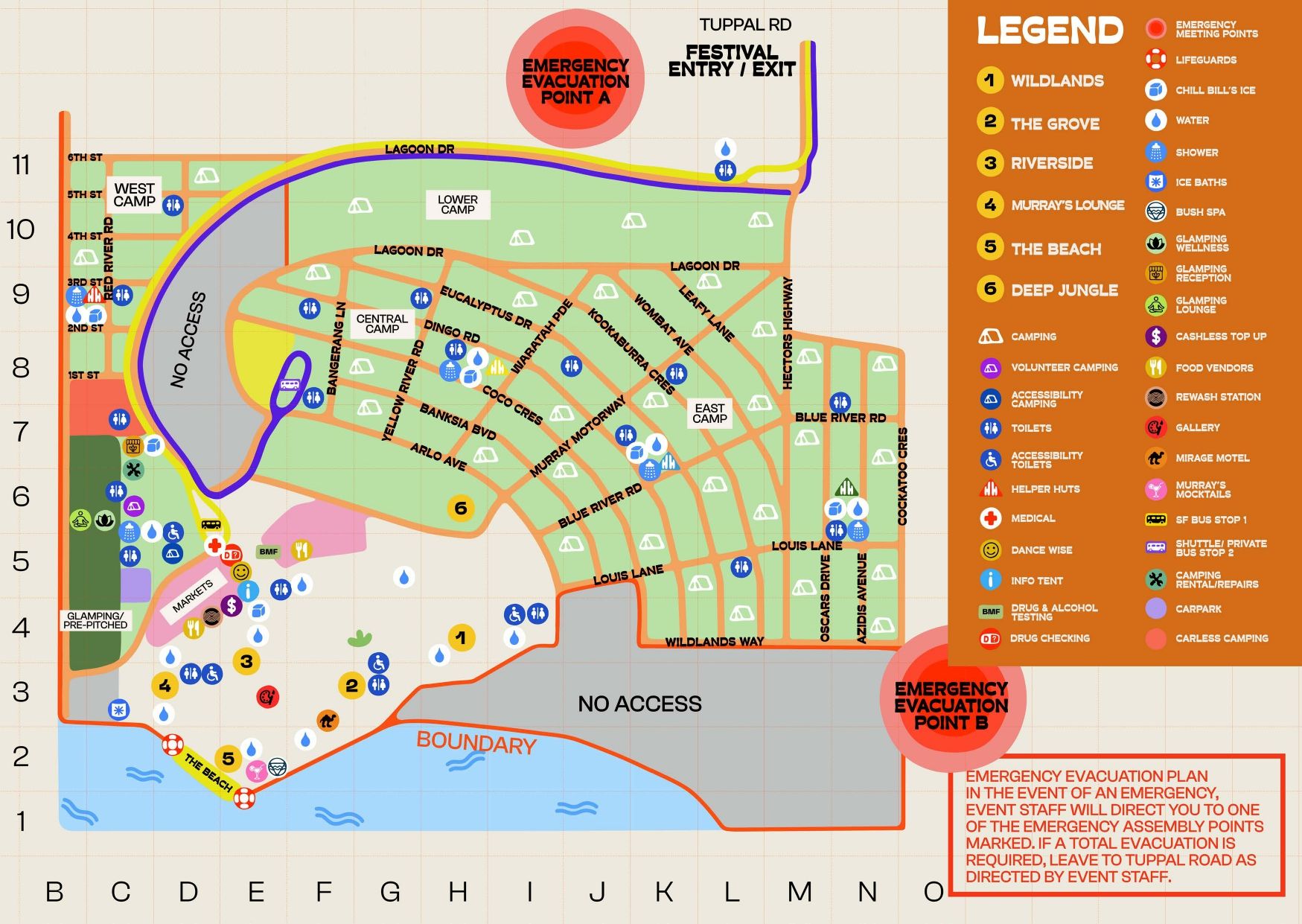 Festival organisers have encouraged attendees to familiarise themselves with the layout ahead of time, with the map available on the Woov app as well as printed copies inside the Survival Guides handed out on arrival. With the site sprawling across open bushland and riverfront terrain, understanding the layout will help punters make the most of their time and avoid long walks between stages.