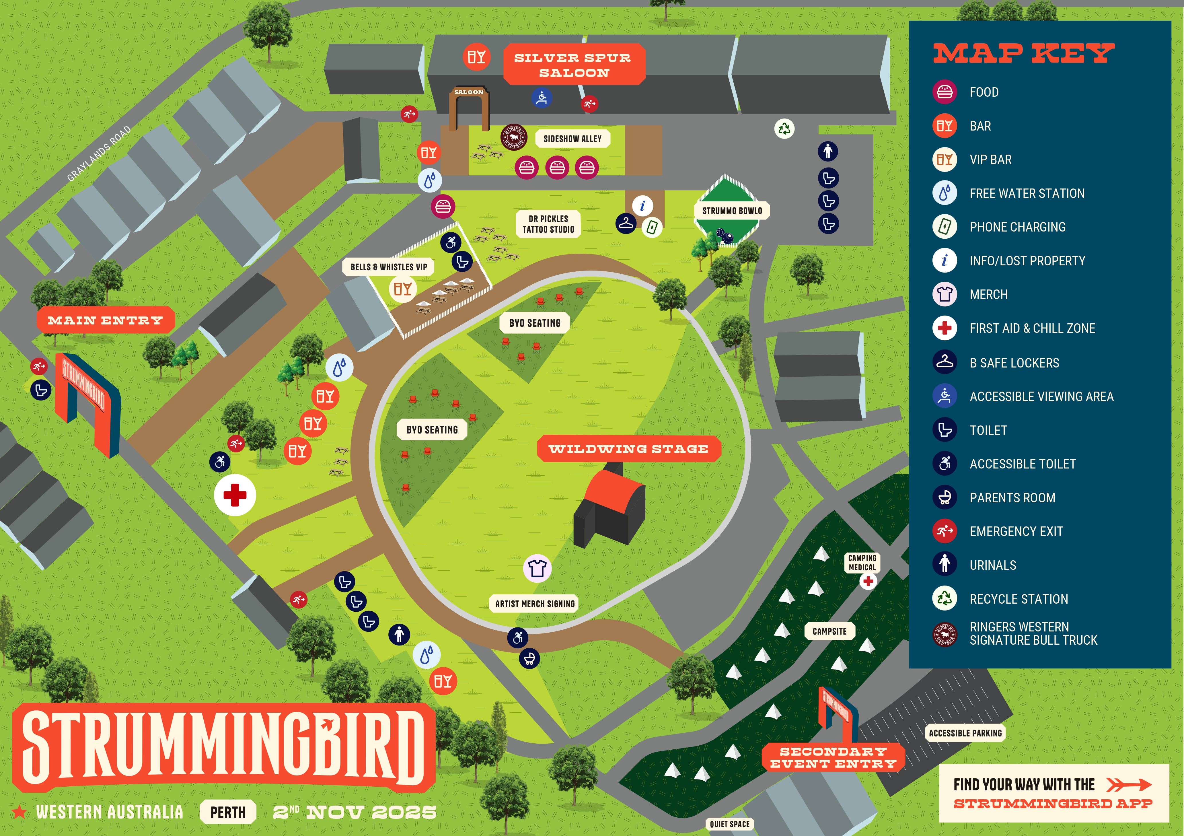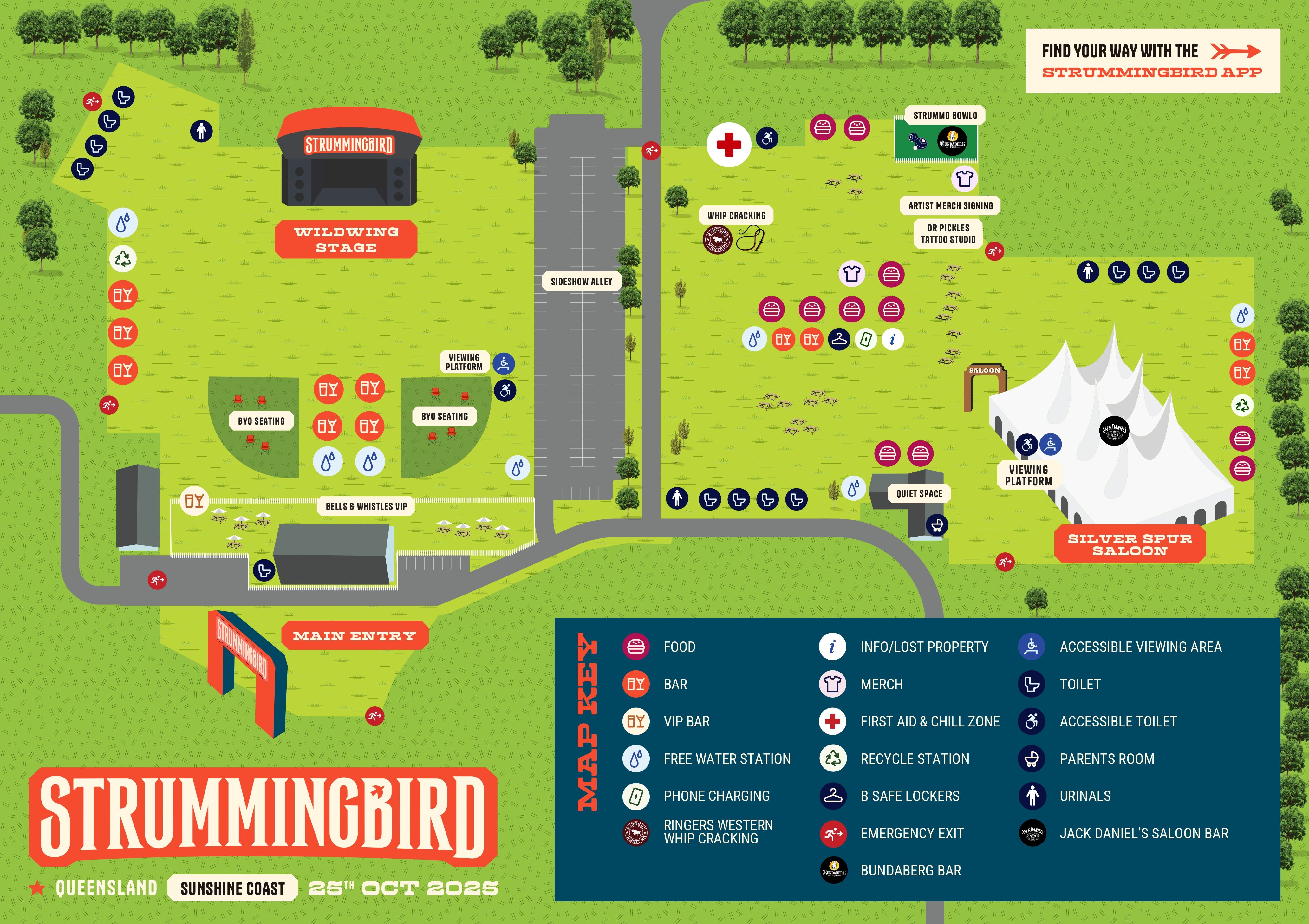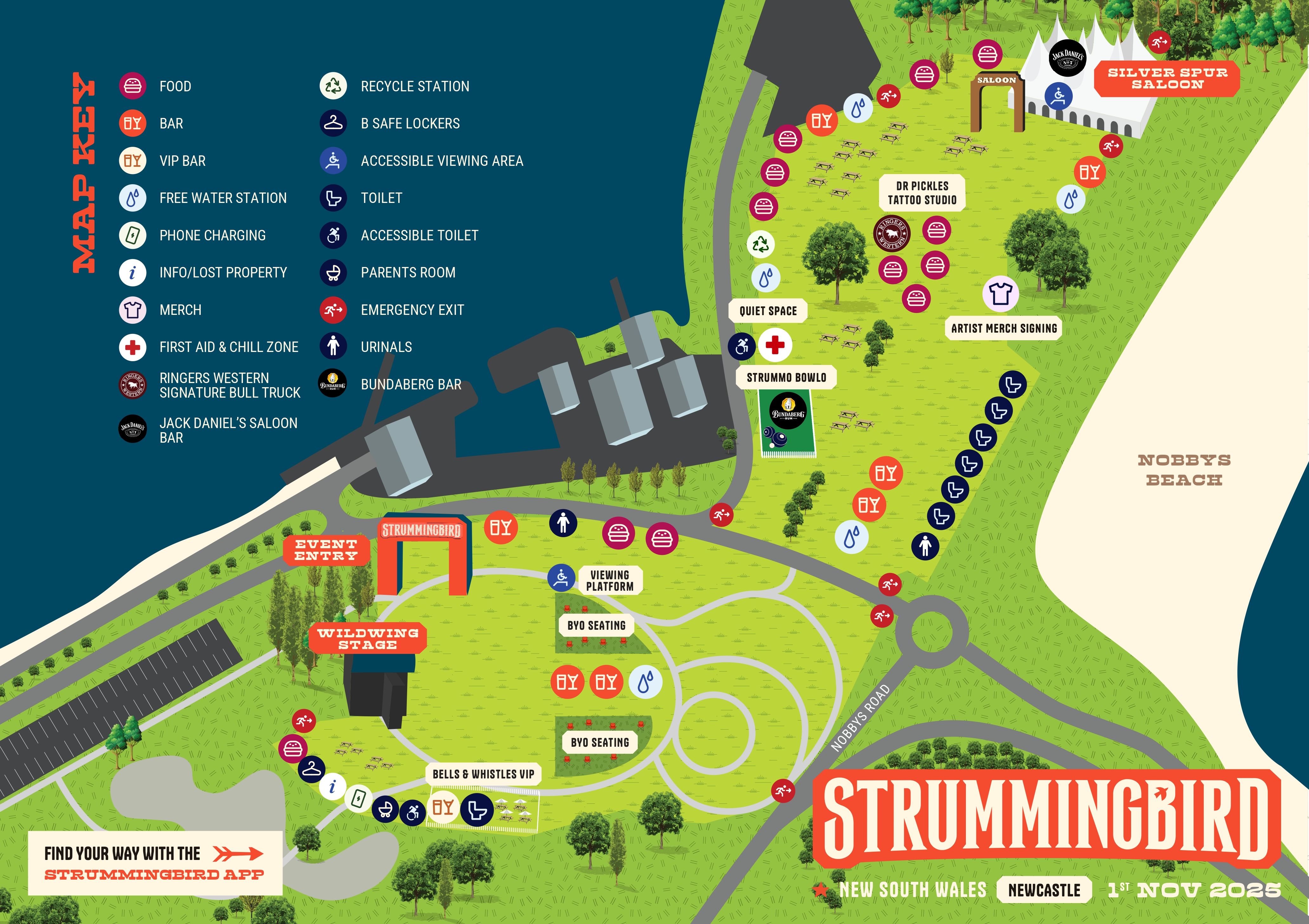With the first stop of Strummingbird 2025 just around the corner, organisers have unveiled the official festival maps for each city on the tour. Featuring detailed layouts for the Sunshine Coast, Newcastle, and Perth shows, the maps reveal everything fans need to know to navigate the event with ease — from stage locations to bars, food vendors, toilets, and entry points.