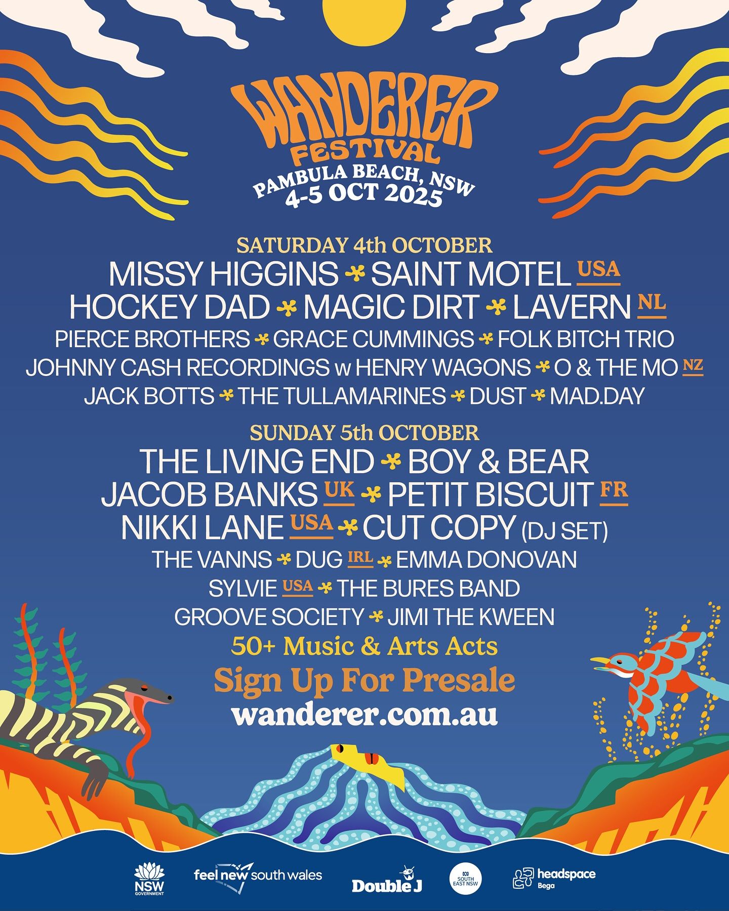 The 2025 lineup is headlined by Missy Higgins, bringing her beloved catalogue to the Saturday night stage, alongside US indie-pop favourites Saint Motel, surf-rockers Hockey Dad, grunge pioneers Magic Dirt, and Dutch DJ Lavern. Sunday’s bill is equally stacked, featuring Aussie rock legends The Living End, folk favourites Boy & Bear, UK soul artist Jacob Banks, French producer Petit Biscuit, country firebrand Nikki Lane (USA), and a rare DJ set from Cut Copy. Over 60 acts are set to perform across the weekend, offering something for every taste and age.